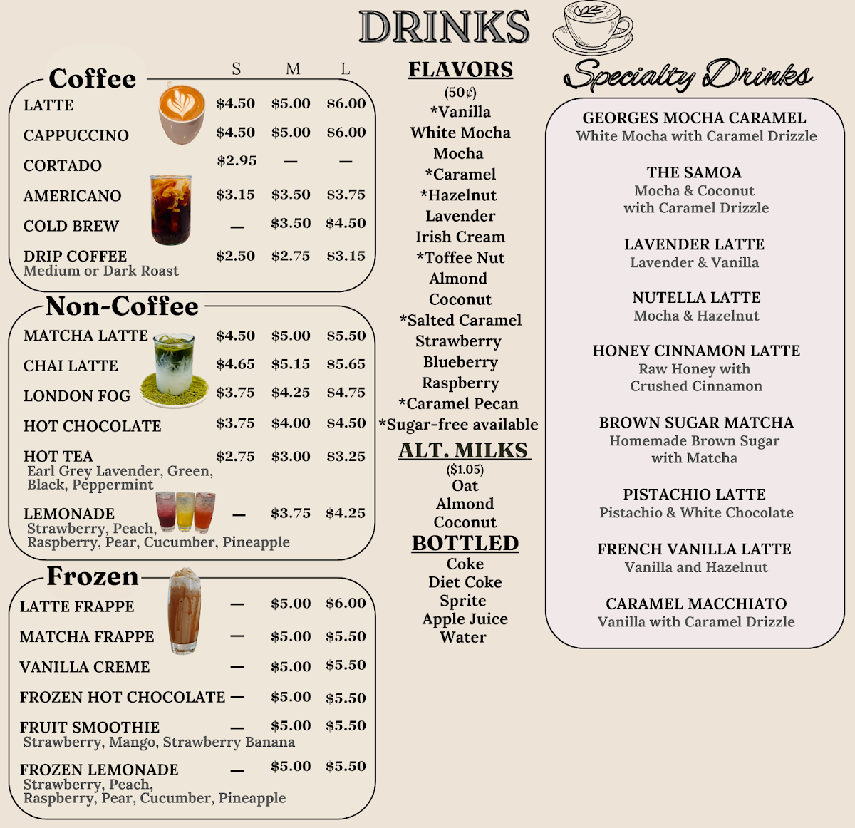 Whether you’re looking to work, gather with friends, or simply indulge in expertly crafted beverages, Georges Coffee @ 121 is the place to be!